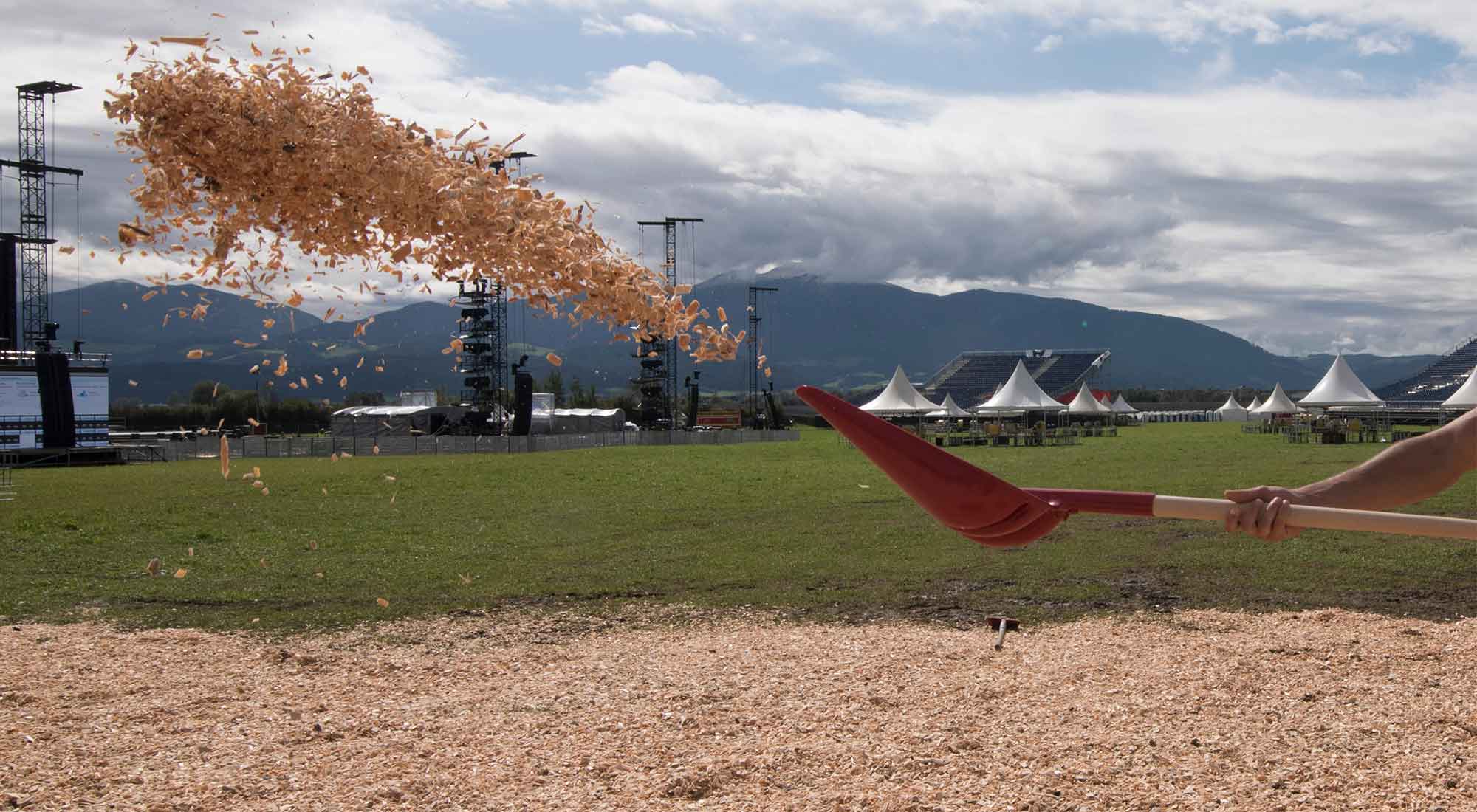 Compared to plastic matting or metal trackway, woodchip blends into outdoor settings. It reads rustic, relaxed, and festival-appropriate rather than a construction site.